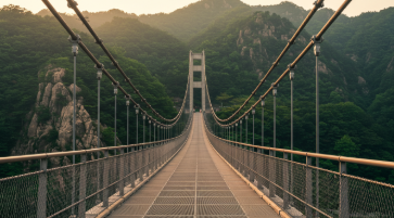- 양쪽 절벽 사이로 길게 이어지는 다리를 배경으로,